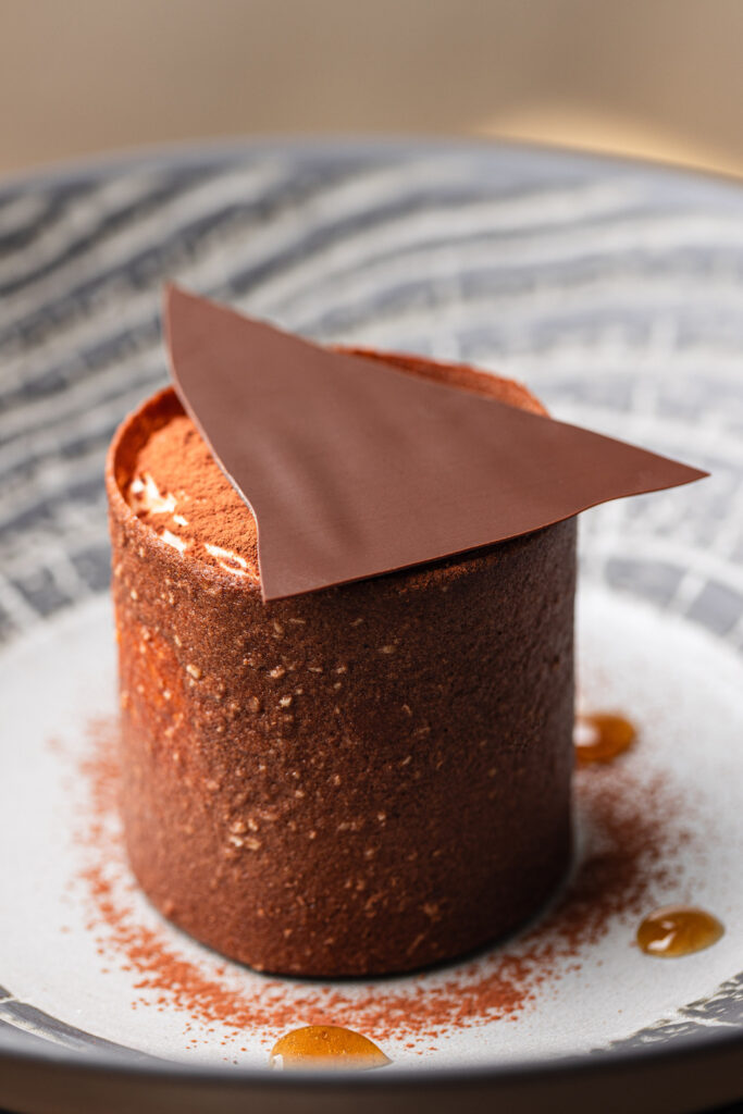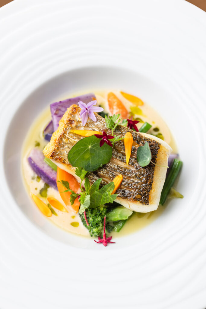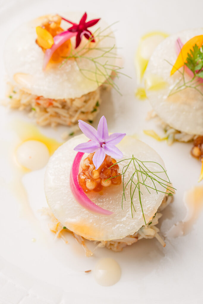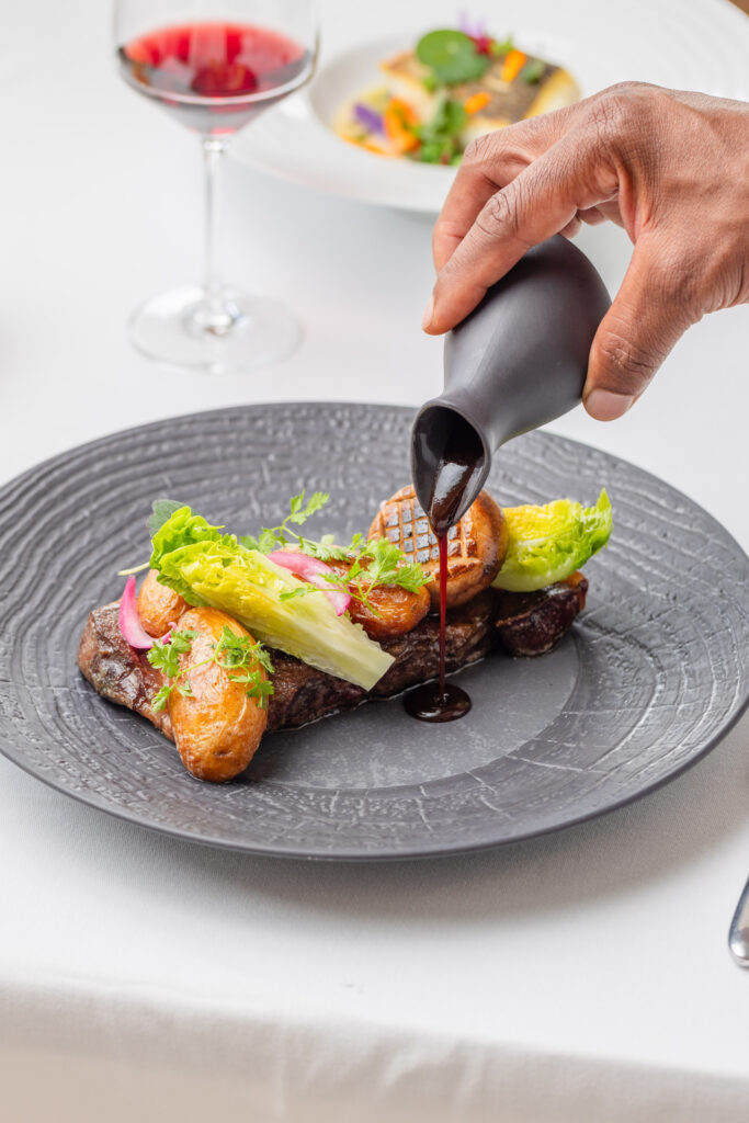 Dans le menu court en 5 temps, la langoustine juste saisie, christophines acidulées & combava, précède un turbot confit, laitue de mer, puis un agneau confit cuit basse température, jus réduit au tartare d’algues. Le grand parcours en 8 temps ajoute la chair d’araignée au ponzu tomate et une dégustation de fromages incluant quelques productions locales avant l’apothéose sucrée : citron, olive noire Kalamata & chocolat Nyangbo.