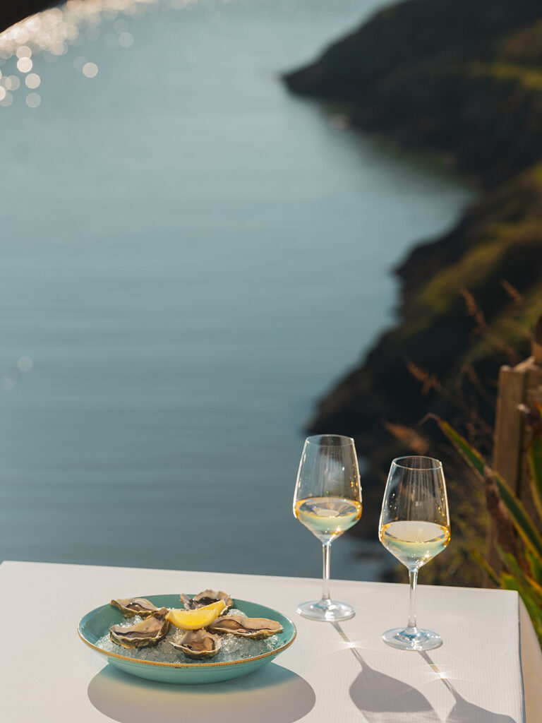 Perché à flanc de falaise, le 180° embrasse littéralement Belle‑Île : trente couverts seulement, répartis entre une salle aussi cosy que conviviale et une terrasse qui semble flotter au‑dessus des vagues. Le rêve pour une halte gourmande, le regard immergé dans la baie de Goulphar et ses falaises sculptées par les vents. Omniprésente jusqu’au coucher du soleil, la lumière naturelle sublime chaque détail d’un décor marin épuré.