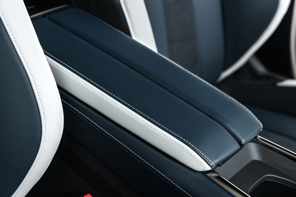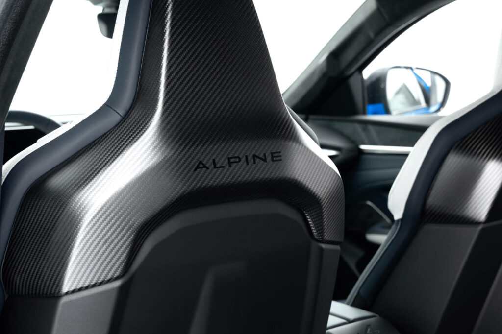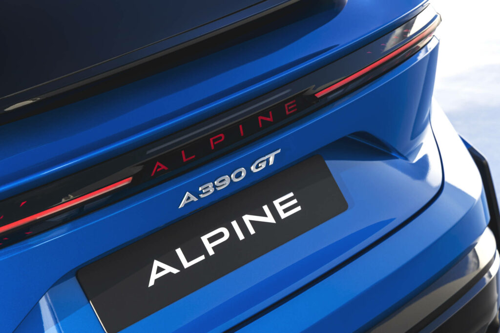 À l’arrière, des triangles fragmentés encadrent un logo Alpine en toutes lettres rétro-éclairé. Enfin, les fines barres lumineuses à l’avant et à l’arrière, qui semblent fendre l’air comme une lame, évoquent la légèreté. Chaque détail est pensé, jusqu’au logo latéral A de Alpine, dont la flèche est toujours dirigée vers l’avant ou la possibilité d’avoir un drapeau tricolore sur le pilier C, comme l’A110.