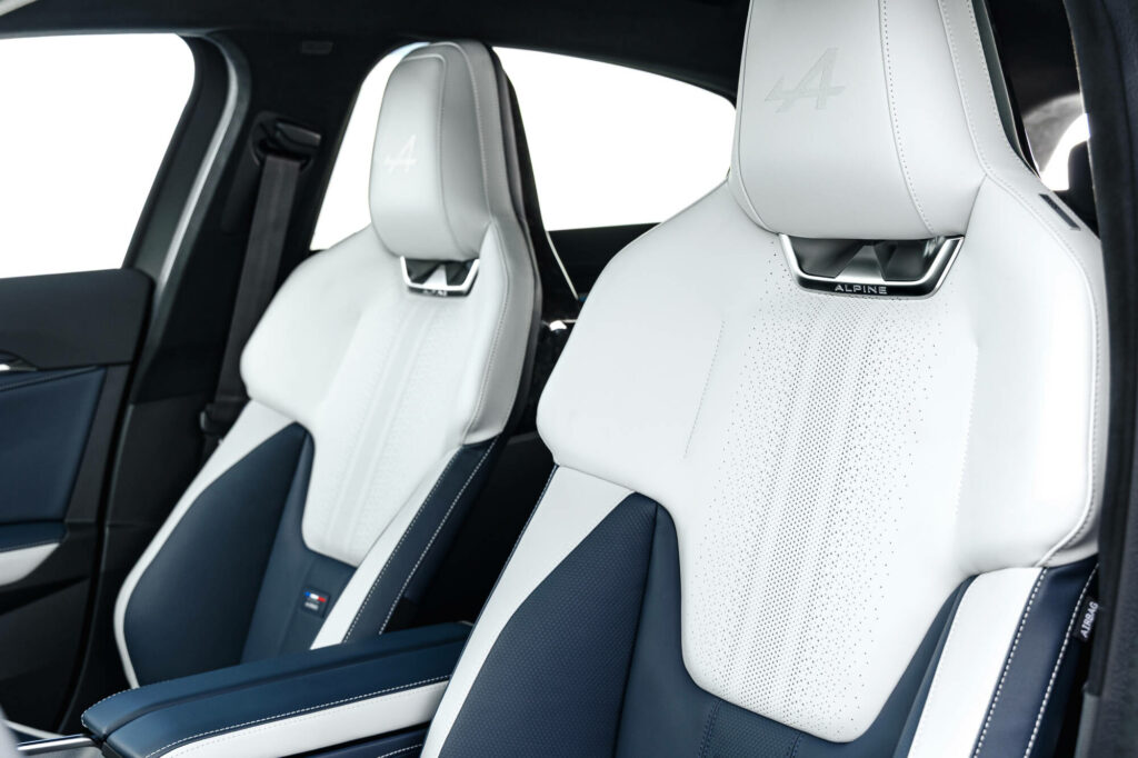 Le poste de conduite est orienté vers le conducteur, qui trouve face à lui des écrans haute définition de 12,3 et 12 pouces aux graphismes le plongeant dans l’univers Alpine. Les commandes physiques de climatisation permettent d’intervenir sur leurs réglages sans quitter la route des yeux. Le volant sport, chauffant, est gainé de cuir Nappa bleu et comprend un méplat et un point milieu.
