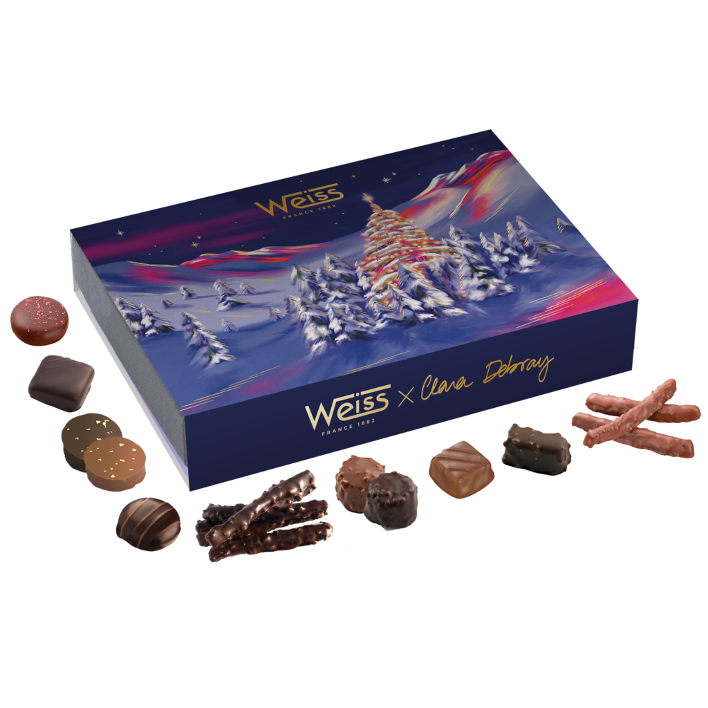 Cette collection limitée capture l’essence intemporelle de Noël : des lumières chaleureuses, des chalets couverts de neige et une nature généreuse où trône l’arbre enchanté, le sapin de Noël illuminé par la magie de Noël et symbole de cette tradition festive. Chaque création allie le savoir-faire artisanal plus que centenaire de la chocolaterie à l’univers poétique Clara Debray infusé de la magie de Noël.