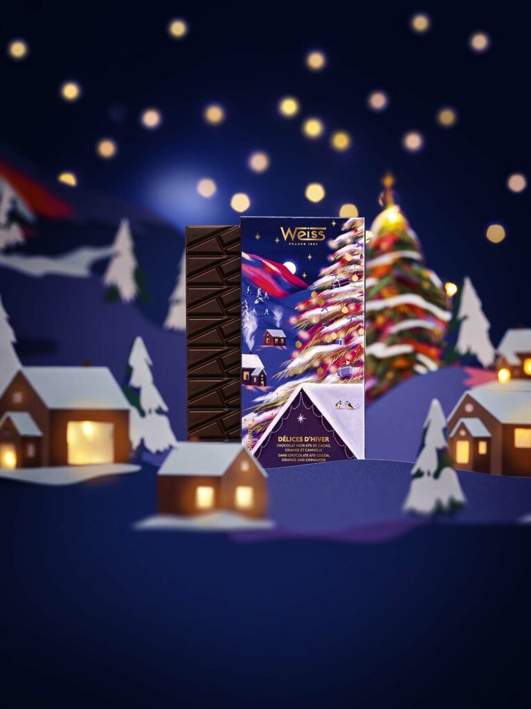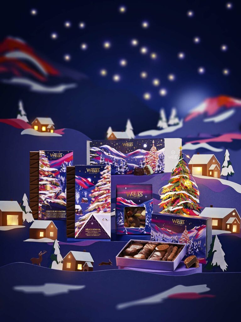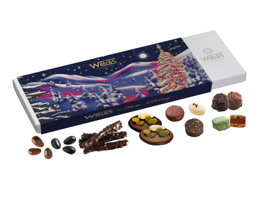 La collection de chocolaterie Weiss est exceptionnelle : raffinement, illustration, packaging, recettes uniques … Weiss propose une collection haut de gamme avec un univers qui invite toujours au rêve et à la poésie.