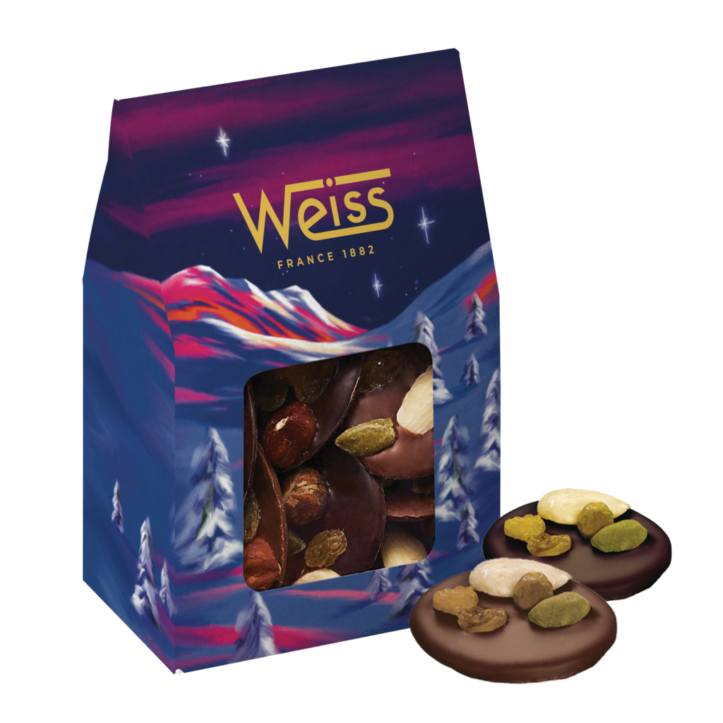 La chocolaterie Weiss puise dans son patrimoine de recettes traditionnelles pour offrir des saveurs authentiques, élaborées exclusivement à partir d’ingrédients nobles comme les amandes Valencia d’Espagne, noisettes Romaines d’Italie. Et comme toujours chez Weiss, chaque recette est réalisé avec du lait et du sucre français et est sans colorants ni arômes artificiels.