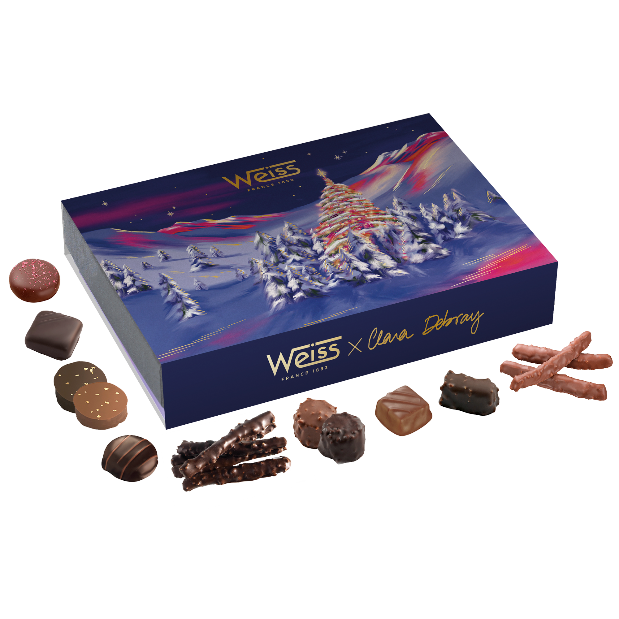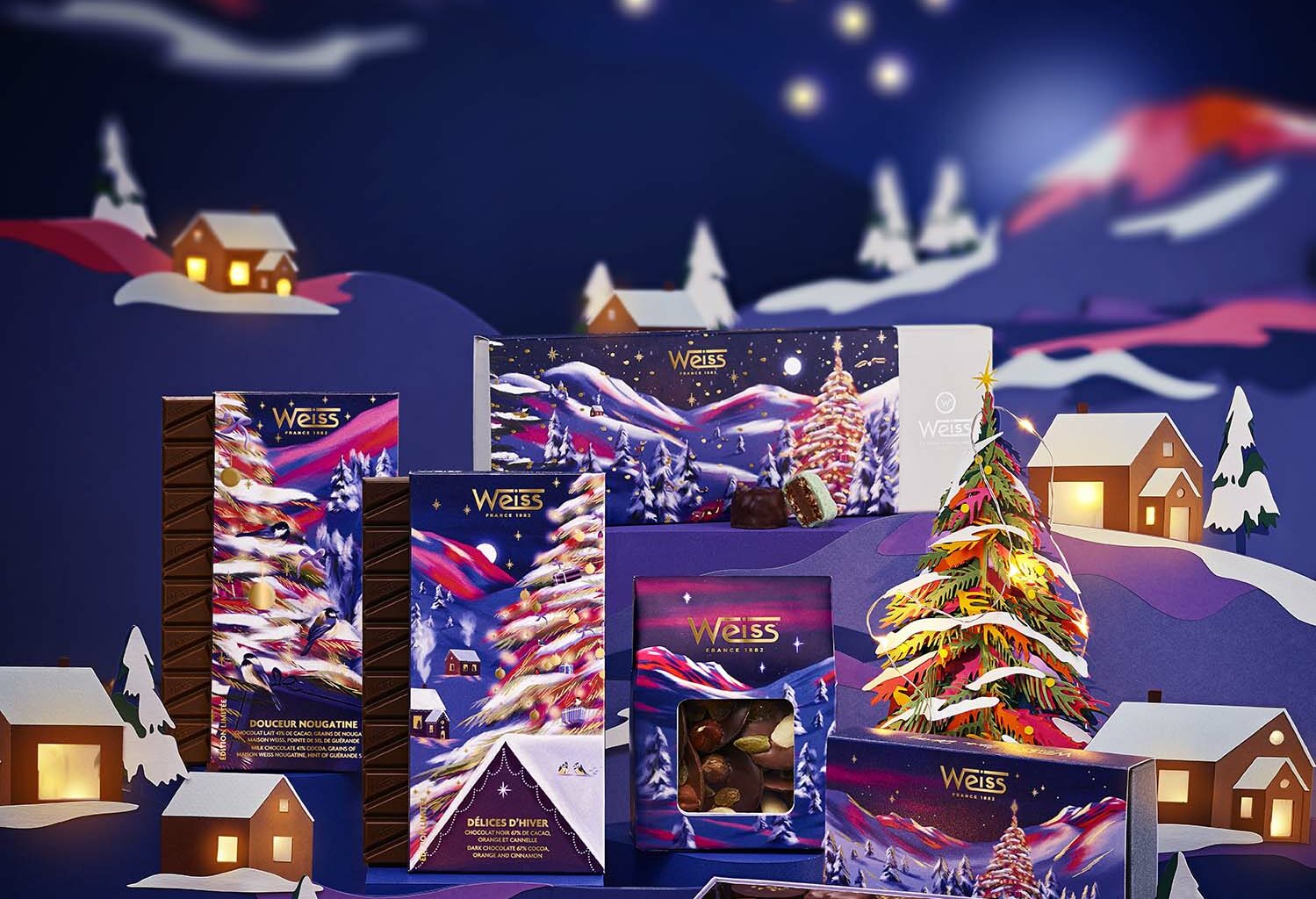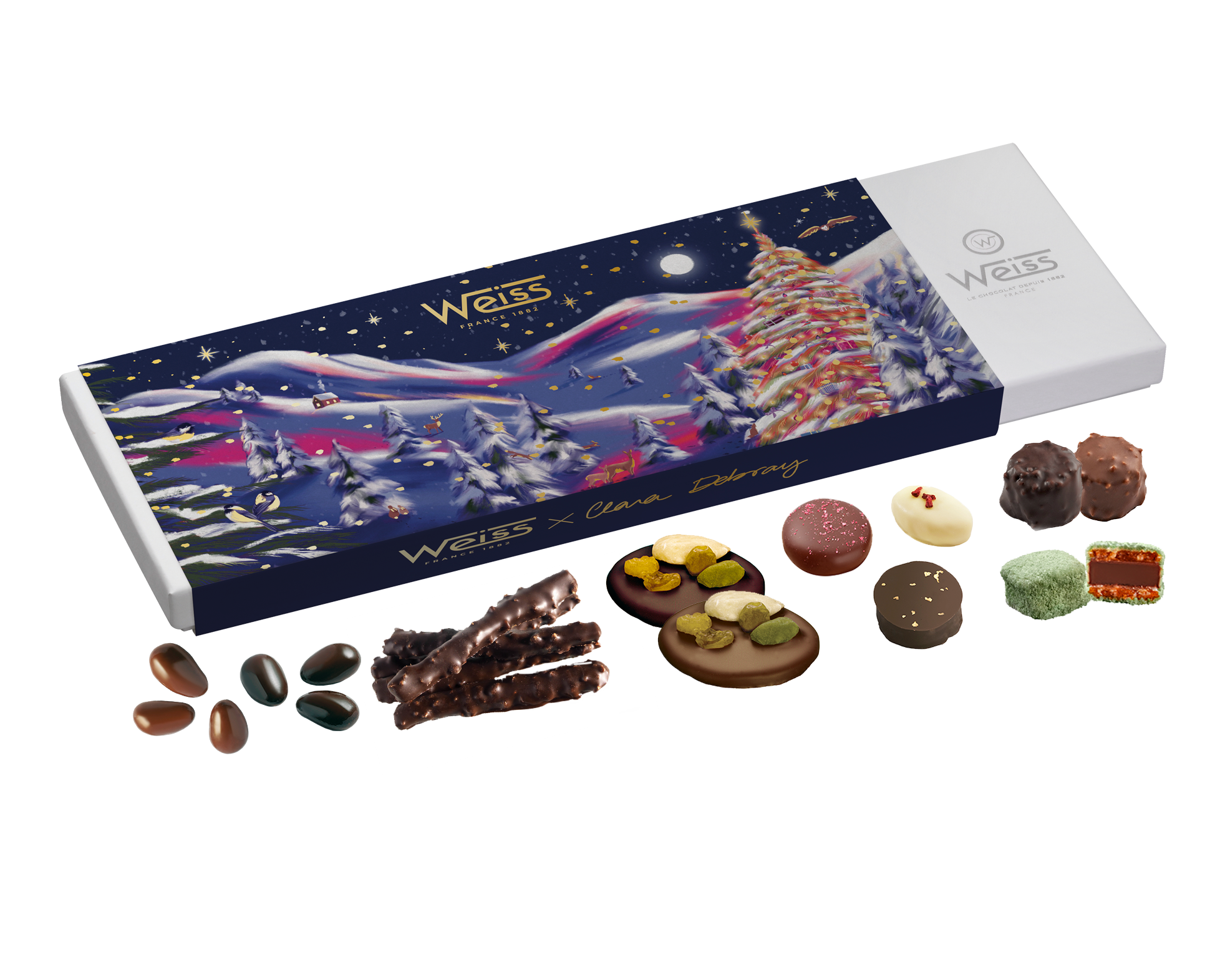 La collection de chocolaterie Weiss est exceptionnelle : raffinement, illustration, packaging, recettes uniques … Weiss propose une collection haut de gamme avec un univers qui invite toujours au rêve et à la poésie.