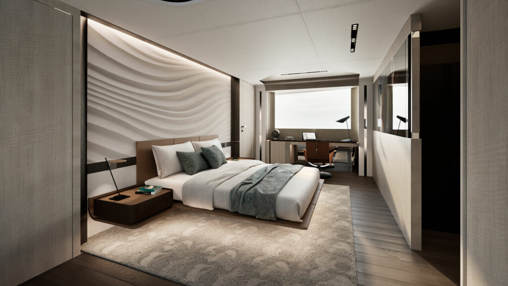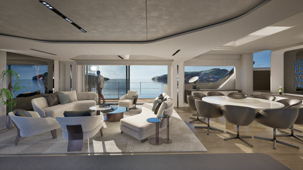 Afin d’optimiser les volumes intérieurs, le pont avant est uniquement situé à bâbord. Au milieu du navire, près du salon, un balcon ouvrant offre une vue privilégiée, même depuis l’intérieur, renforçant ainsi le dialogue constant entre intérieur et extérieur.