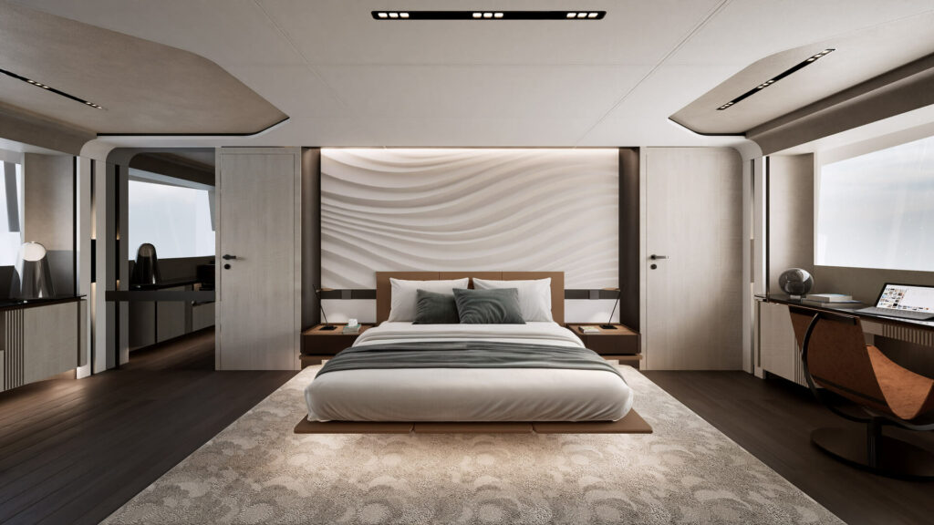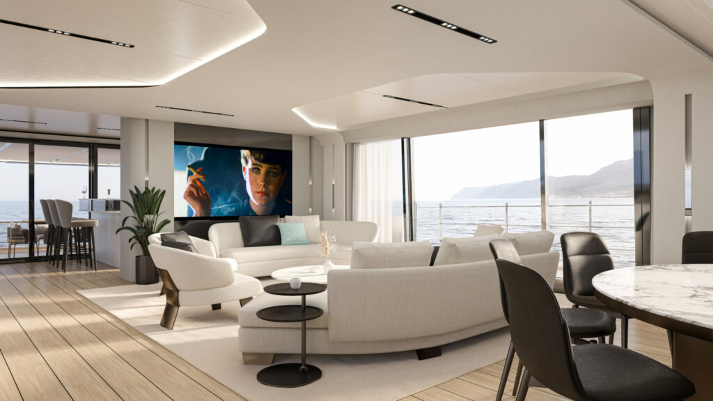 À l’avant, la zone de proue comprend une piscine circulaire entourée de bains de soleil et de canapés, conçue comme un espace de détente exclusif.