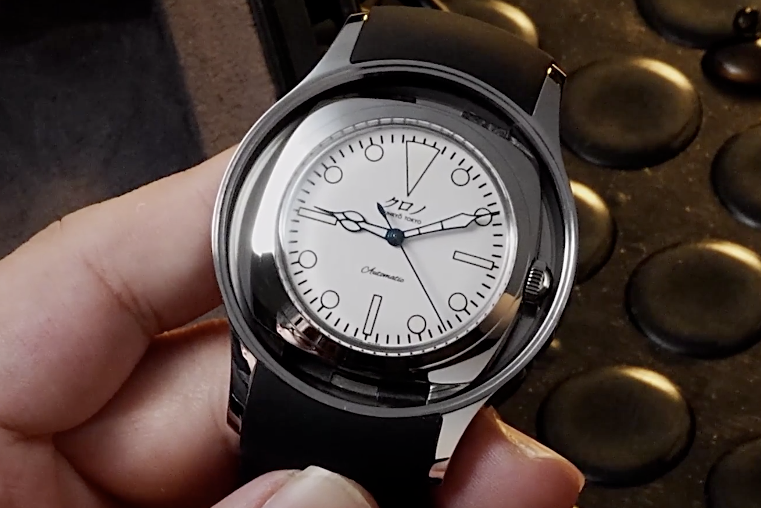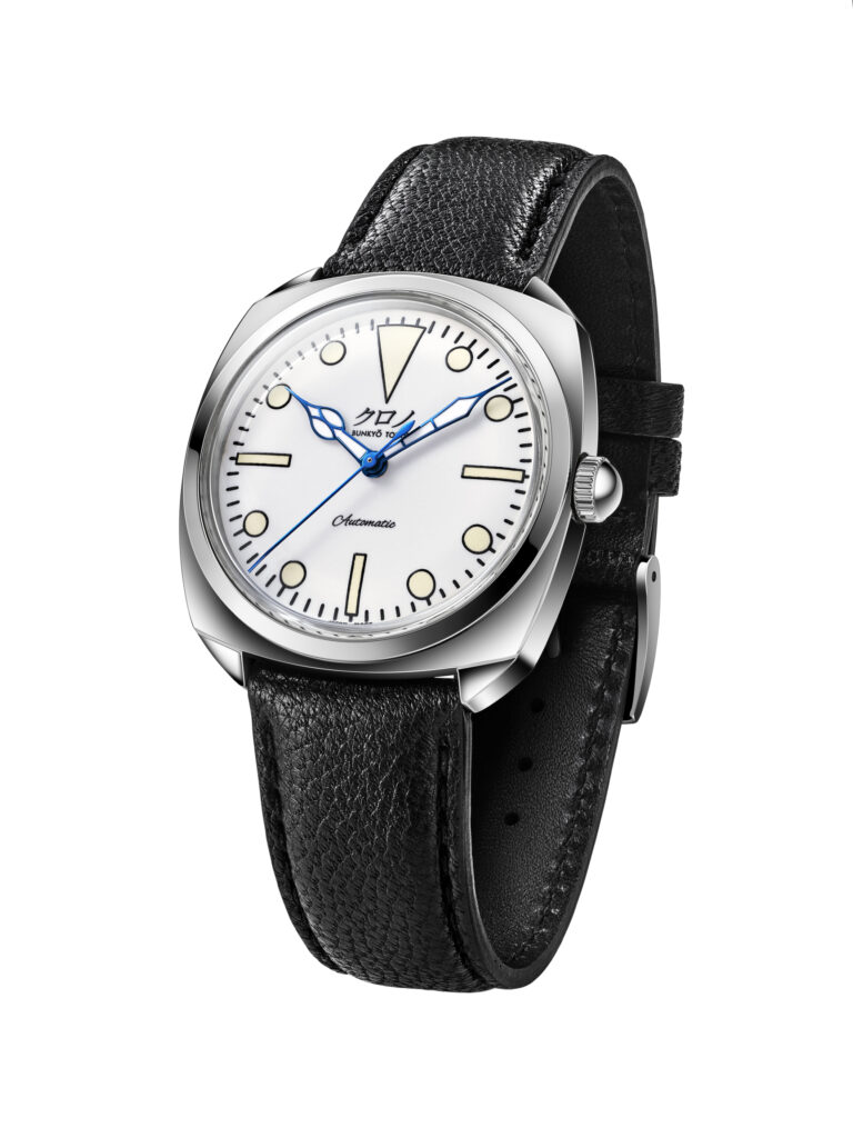 La montre intérieure marque les débuts du tout premier boîtier de forme coussin de Kurono Tokyo. Afin d’assurer une lisibilité maximale sous l’eau, les index et les aiguilles sont dotés d’une finition luminescente. Les aiguilles cathédrales sont en acier bleu, minutieusement squelettées à l’extrême afin d’augmenter l’efficacité de la luminescence.