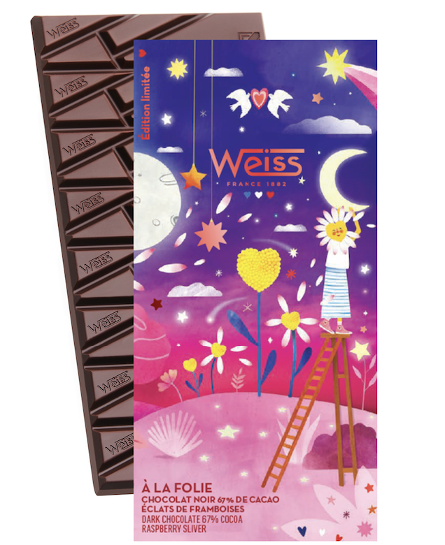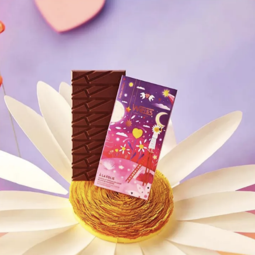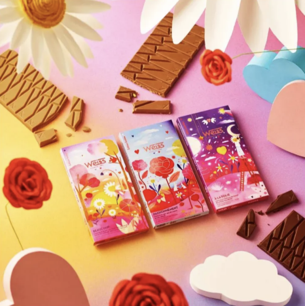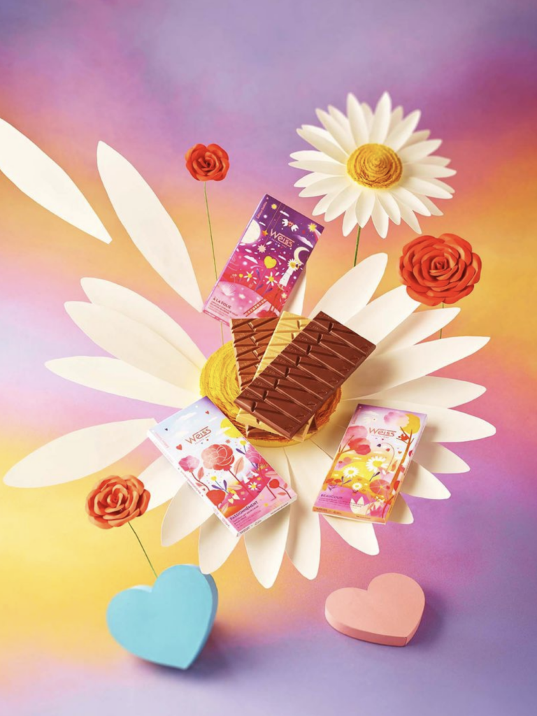 Weiss présente sa collection capsule signée par l’artiste Laura Lhuillier, nommée « L’Amour ». Et l’amour du chocolat, cela fait plus de 140 ans que la Chocolaterie Weiss le célèbre sous toutes ses formes, depuis 1882 exactement. Un carré, un morceau, la tablette entière – un peu, passionnément, à la folie ! C’est l’amour de la gourmandise chocolatée avec un grand A.