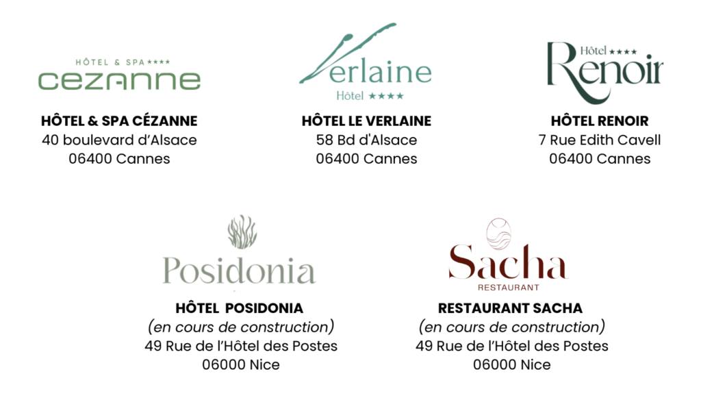 Le groupe annonce en effet l’acquisition de trois hôtels emblématiques de Cannes, idéalement situés à proximité de la Croisette et de la rue d’Antibes : l’hôtel Verlaine**** (46 chambres), l’hôtel & Spa Cézanne**** (29 chambres) et l’hôtel Renoir**** (31 chambres) .