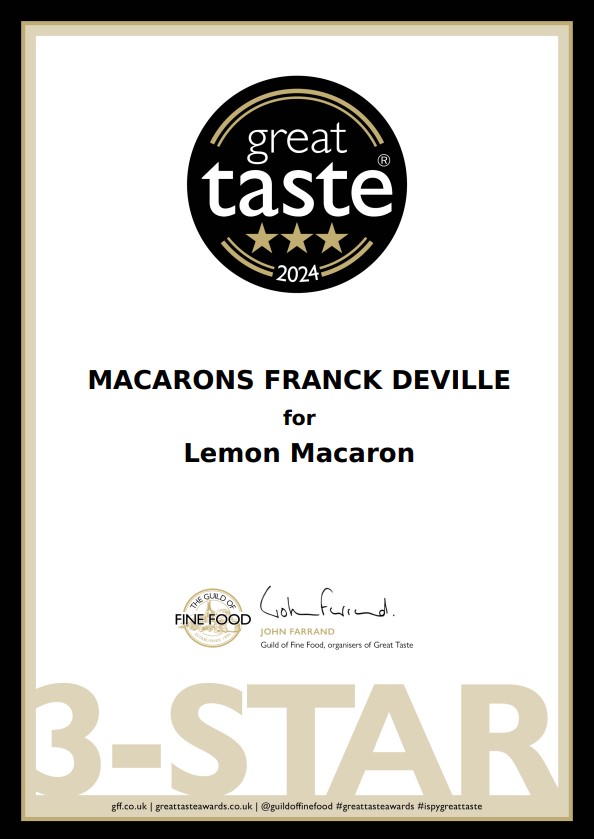 2024 – Obtention de la plus haute distinction au Concours The Great Taste Award 2024 pour notre macaron citron – 3 étoiles.