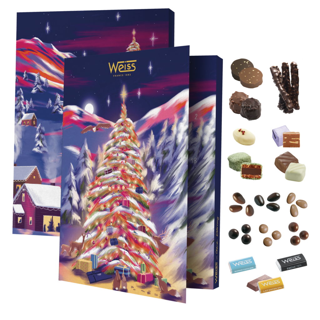 La Chocolaterie Weiss, Maison artisanale fondée en 1882, invite cette année, petits et grands à célébrer les fêtes de fin d’année, via sa nouvelle collection limitée « Weiss et l’arbre enchanté », à travers les jolies illustrations de Clara Debray.